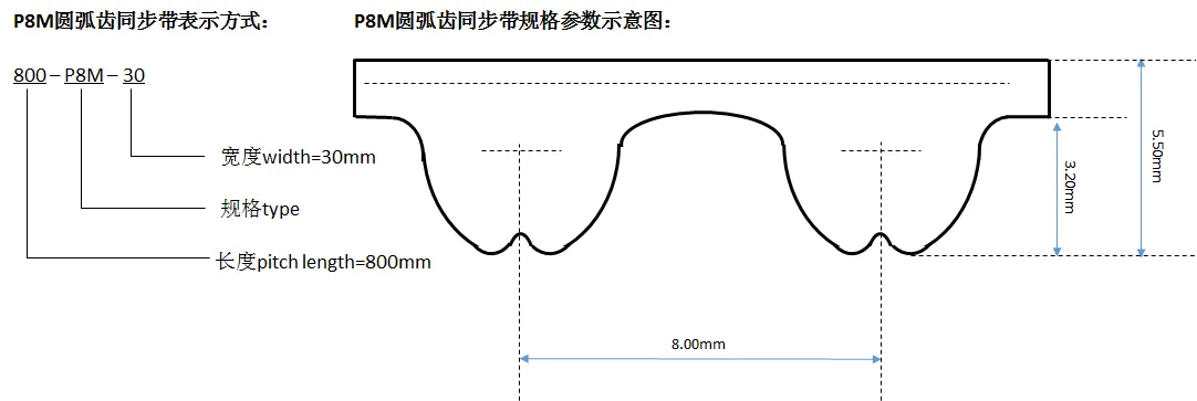 P8M型同步帶其齒距為(wèi)8.00mm,齒厚3.20mm,帶厚5.50mm