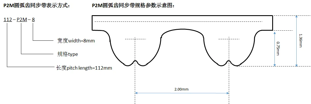 P2M型同步帶其齒距為(wèi)2.00mm,齒厚0.76mm,帶厚1™.36mm