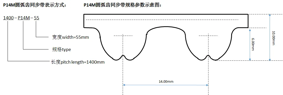 P14M型同步帶其齒距為(wèi)14.00mm,齒厚6.00≈mm,帶厚10.00mm