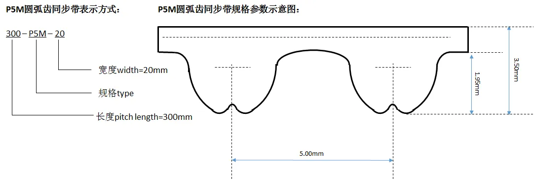 P5M型同步帶其齒距為(wèi)5.00mm,齒厚1.95mm,帶厚3.50mm